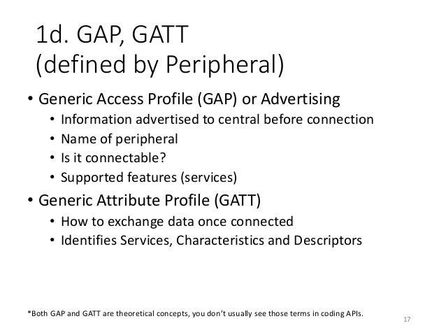 Sometimes this is not an issue. For example, you may have a custom peripheral device with a custom service, but in your central device app you may know that it also provides the Battery Service and other services. GAP also supports so-called Broadcast packets, which send out information without expecting to open a connection with anyone. Apple's iBeacon technology relies on Broadcast packets. GATT The Bluetooth LE protocol operates on multiple layers. General Attribute Profile (GATT) is the layer that defines services and characteristics and enables read/write/notify/indicate operations on them.